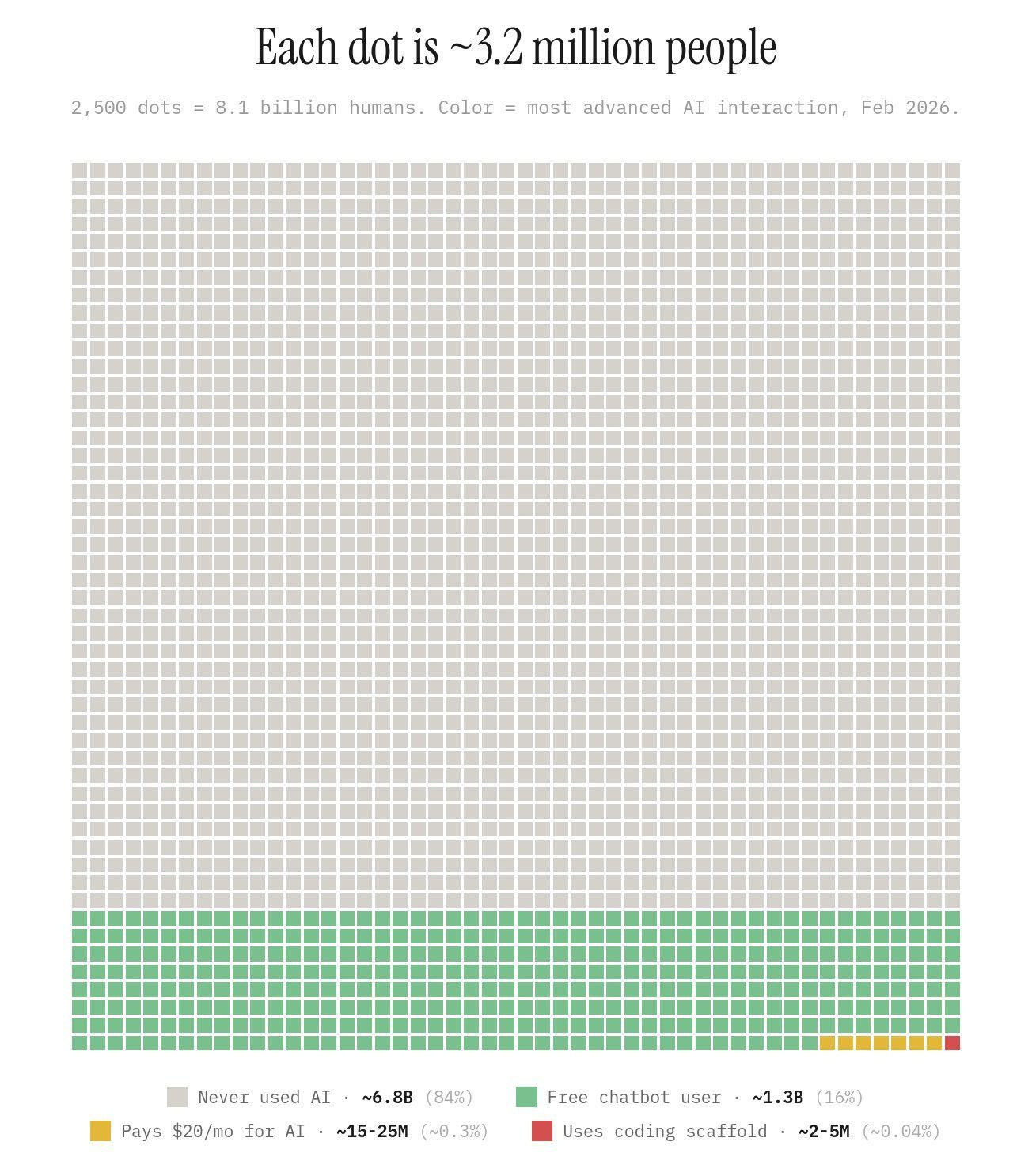 A single image has been circulating widely in AI and creative technology communities over the past month. It shows 2,500 dots, each representing roughly 3.2 million people, colour-coded by their level of AI engagement. The sea of grey is vast: 84% of humanity, around 6.8 billion people, who have never used a chatbot. A band of green at the bottom represents the 1.3 billion who use free tools. A thin yellow sliver marks the 15–25 million paying around $20 a month. And a tiny dot of red indicates the 2–5 million using AI to an advanced level on agentic platforms such as Cursor, Google Antigravity and Claude Code.